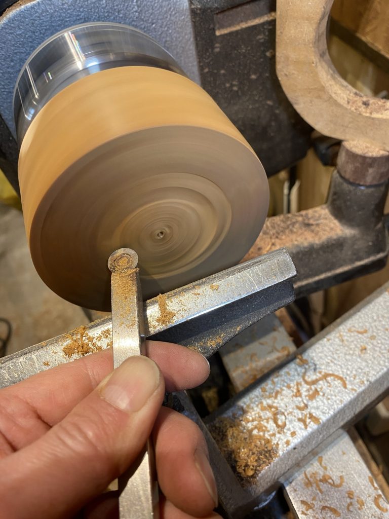 ①土台はウッドターニングでご自身で無垢の木材から好きな形に削り出していただきます。磨きを重ねて仕上げます。